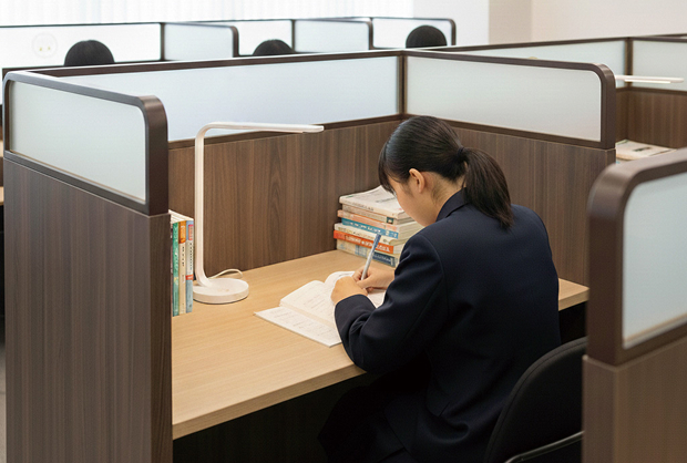 集中力を高めるためにパーテーションで仕切られた個別ブースです。講師と1対1になれる空間で、周囲を気にせずに生徒が講師に質問しやすい環境を提供します。
